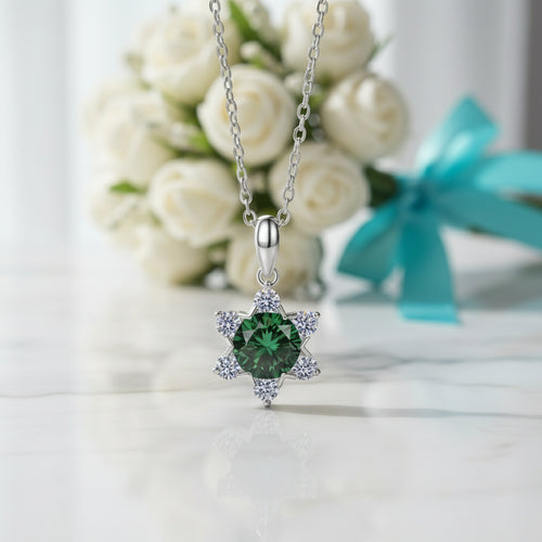 Adorn yourself with the vibrant, life-affirming energy of our 1.0 Ct Round Emerald Birthstone Snowflake Pendant Necklace. Wearing an emerald is like stepping into a fresh dawn, inviting serenity, prosperity, and the boundless potential of new beginnings. Let this timeless gem be your personal talisman, illuminating your path with optimism and radiant grace.