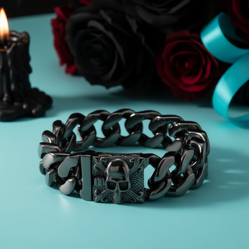 Black stainless steel Cuban chain bracelet featuring a vintage skull pendant. This sophisticated piece combines classic chain styling with bold gothic aesthetics, offering a refined edge to any wardrobe. Durable construction ensures lasting wear for everyday styling.