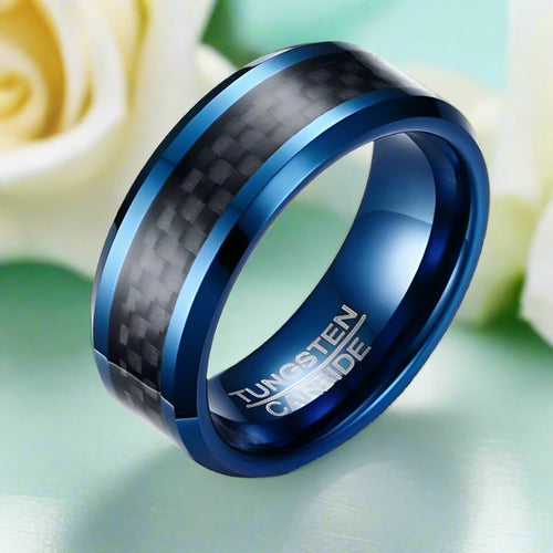 Upgrade your style with Evani Naomi Jewelry's Classic Blue & Black Tungsten Men's Wedding Band. This 8mm band features a stunning black and blue design, crafted with precision and ethically sourced materials. Own this timeless piece at an affordable price for a symbol of everlasting commitment.