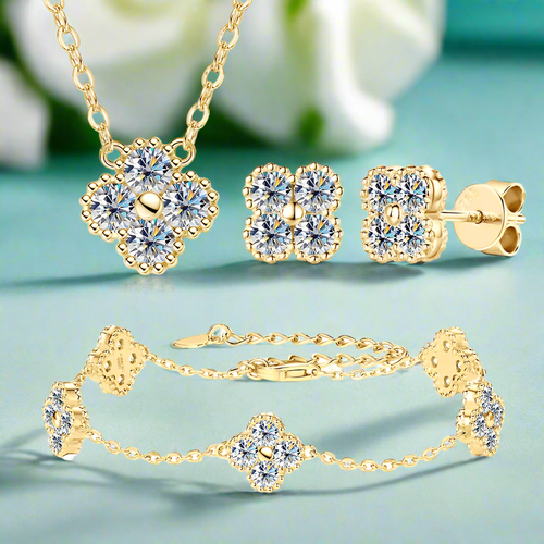 Elevate your style and stand out from the crowd with this gorgeous Clover Leaf Necklace Earrings and Bracelet Set, featuring stunning certified Moissanite gems. Sparkling with brilliance and boasting unmatched durability, this set is the perfect addition to your jewelry collection. You deserve the best, and with our certified Moissanite, you'll be sure to turn heads and make a lasting impression.