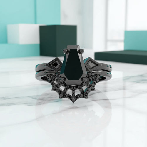 LOVE SPELL Gothic Spider Web Wedding Ring Set in 14k Gold Coffin Cut Moissanite