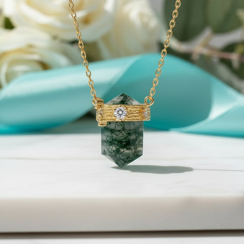In a magical forest, a spirit gave his love a moss agate necklace, a tiny world of green for her to wear. Its gold finish chain shone with the same warmth as his promise of a love as pure and timeless as the forest itself.