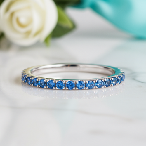 Capture the serene essence of the ocean with our Simple Light Aquamarine Half Eternity Wedding Band. As the birthstone for March, this calming gem is said to bring courage, inner peace, and protection. Its tranquil blue color was famously worn by ancient sailors for good luck at sea, offering a sense of tranquility to your everyday.