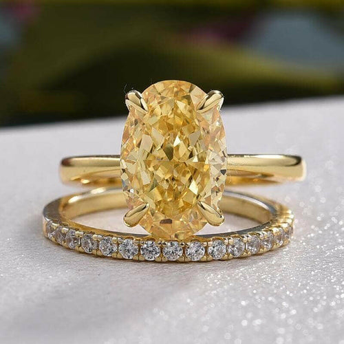 An exquisite bridal set showcasing a 3.5-carat oval-cut yellow diamond set in 14K gold with topaz detailing. This sophisticated piece combines timeless elegance with the November birthstone's symbolism of love and fortune, making it an ideal choice for an engagement or wedding collection.