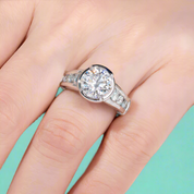 Introducing Nevermore Diamond's Round Cut 3.0 Ct Moissanite Engagement Ring: a sparkling 3.0 Ct round cut moissanite stone with band accents. Handcrafted with premium materials and ethically sourced, this luxurious ring is made from 92.5% pure silver + 7.5% hypoallergenic metals, dipped 5x in 18k white gold. Experience affordable luxury with the brilliance of natural diamonds.