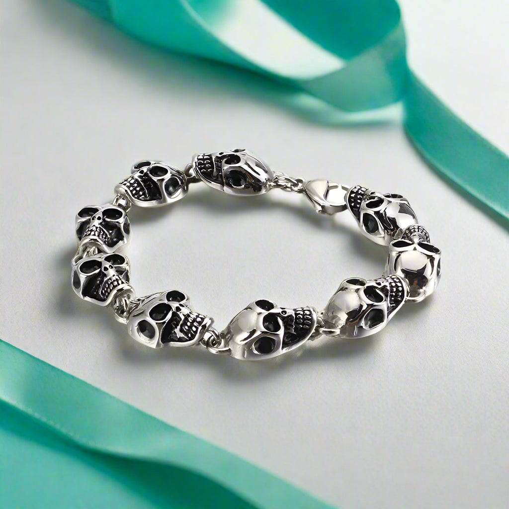 Experience the thrill of the unknown with Punk Lots Of Skull Charm Bracelets. Made of durable stainless steel, this bracelet exudes bold, fierce energy. Featuring a unique skeleton design and a secure lobster clasp, this link chain bracelet is perfect for the fearless risk-taker. Complete your rebellious look with Punk Lots Of Skull Charm Bracelets and embrace the adventure!