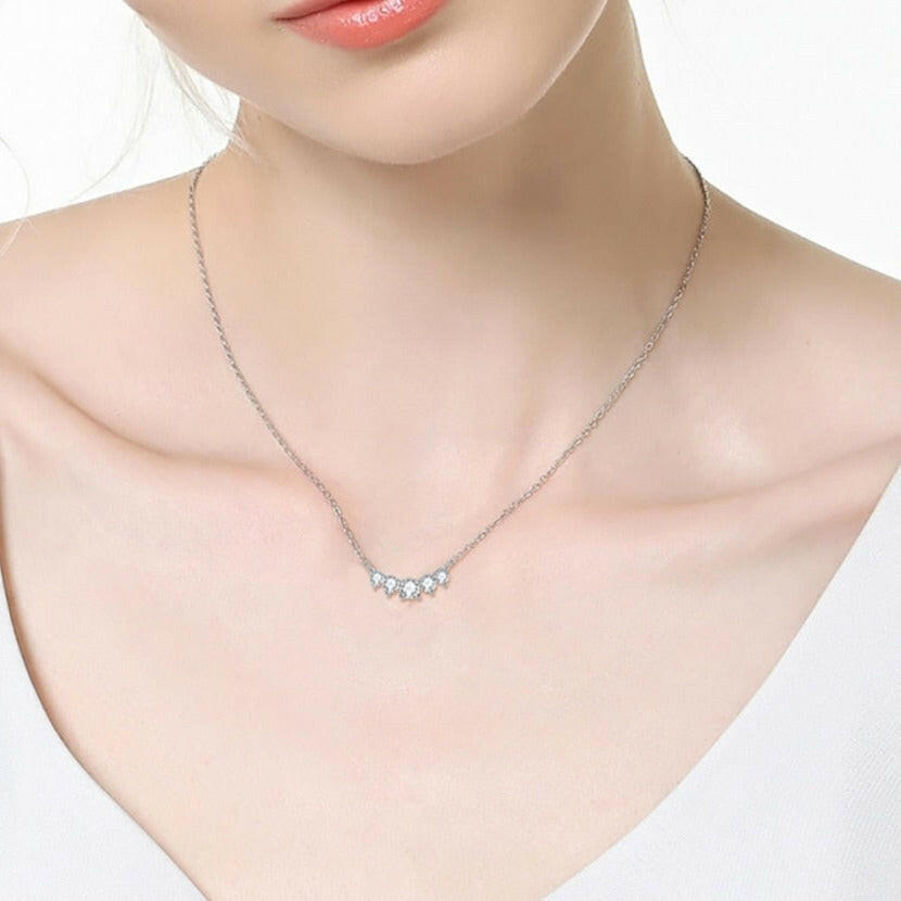 This elegant 0.58 carat Five Stone Moissanite Necklace features brilliant round stones set in 92.5% silver with 18k white gold plating. Ethically crafted and hypoallergenic, it offers lasting beauty and diamond-like sparkle at a fraction of the cost.