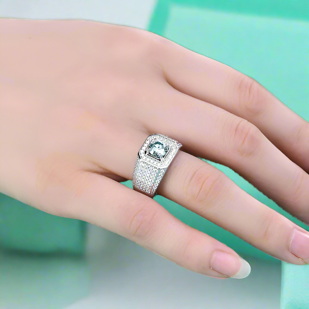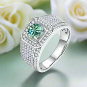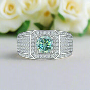 Luxurious 1.0 Ct Round Cut Moissanite Men's Ring featuring a brilliant green stone set in 92.5% pure silver with 18k white gold plating. Handcrafted by expert artisans, this ethical diamond alternative delivers exceptional sparkle and elegance at an accessible price point. A sophisticated statement piece designed for the discerning gentleman.