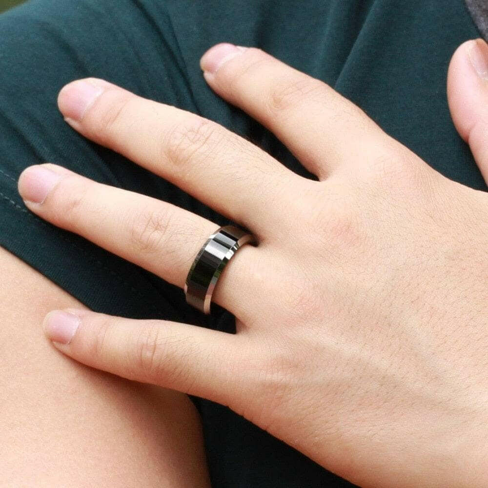 Upgrade your look with our Black Beveled Edge Tungsten Men's Wedding Band by Evani Naomi Jewelry. Handcrafted with ethically sourced materials, this elegant piece exudes confidence. Its timeless black design and beveled edge make it a durable symbol of excellence. Indulge in affordable luxury with this extraordinary ring, a reminder of your commitment.