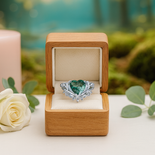Important Note: Our moss agate ring is a poetic celebration of nature's endless beauty. Each piece is unique, with its ethereal green inclusions, like a miniature garden, gracefully entwined with delicate vines and leaves. The design whispers a story of love and new beginnings, symbolizing a bride blooming with her own distinct beauty, surrounded by the tender blessings of a verdant forest. It’s a truly romantic piece, as unique and captivating as the love it represents.