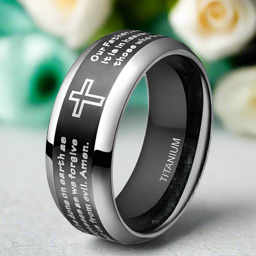 Discover our exquisite Unisex Black Titanium Wedding Band featuring a Bible Verse. Handcrafted for a lifetime of love and commitment, this 8mm band is lightweight and comfortable. Crafted from premium titanium, it's both affordable and ethically sourced. Let your faith radiate with this stunning engraved piece, exclusively designed for you.