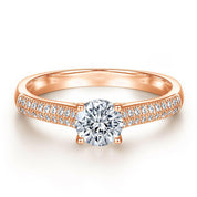 This 0.8 Ct Round Moissanite Engagement Ring Set features expertly crafted bands with sparkling stones, made from high-quality, ethically sourced silver and hypoallergenic metals coated in 18k rose gold. It offers the brilliance of a diamond at a fraction of the cost, combining elegance and lasting beauty in one sophisticated design.