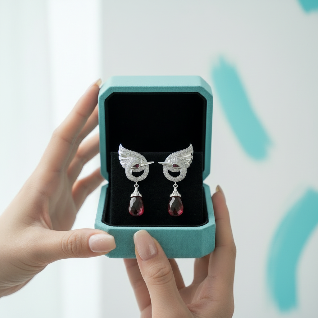 Ignite your passion with our stunning Elegant Swan with Ruby Birthstone Tear Earrings. The Ruby is the highly coveted, fiery red variety of the mineral corundum, known as the "King of Gems." Its intense color, caused by chromium, is traditionally believed to bring good fortune, inspire confidence, and protect its wearer.