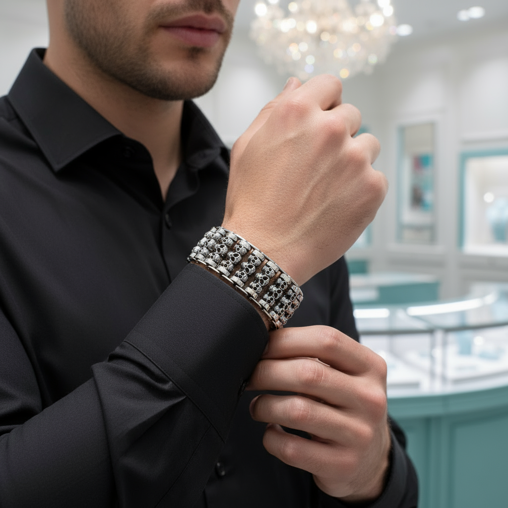 This bracelet is made from tough stainless steel and features a unique charm design with multiple skull heads. The chain is a bold skull pattern, and the clasp is a sturdy fold over type. Embody a fearless and rebellious punk style with this skull bracelet.