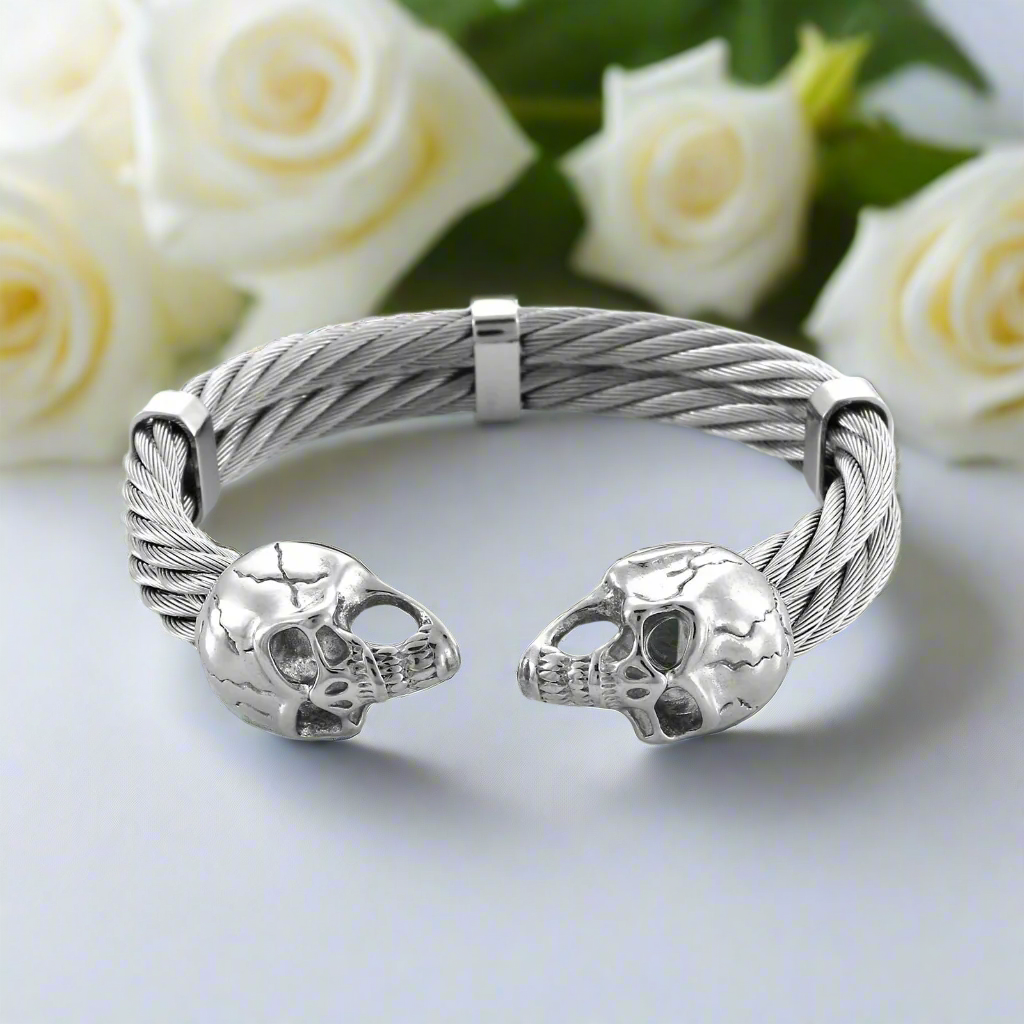 Dive headfirst into the world of gothic fashion with our Gothic Cool Skull Cuff Bracelet by Evani Naomi Jewelry. This badass wire cuff bracelet is made of high-quality stainless steel, available in either sleek silver or mysterious black. Perfect for the manly man who wants to add a touch of punk to his style, this affordable accessory is a must-have for anyone seeking that cool, edgy look.