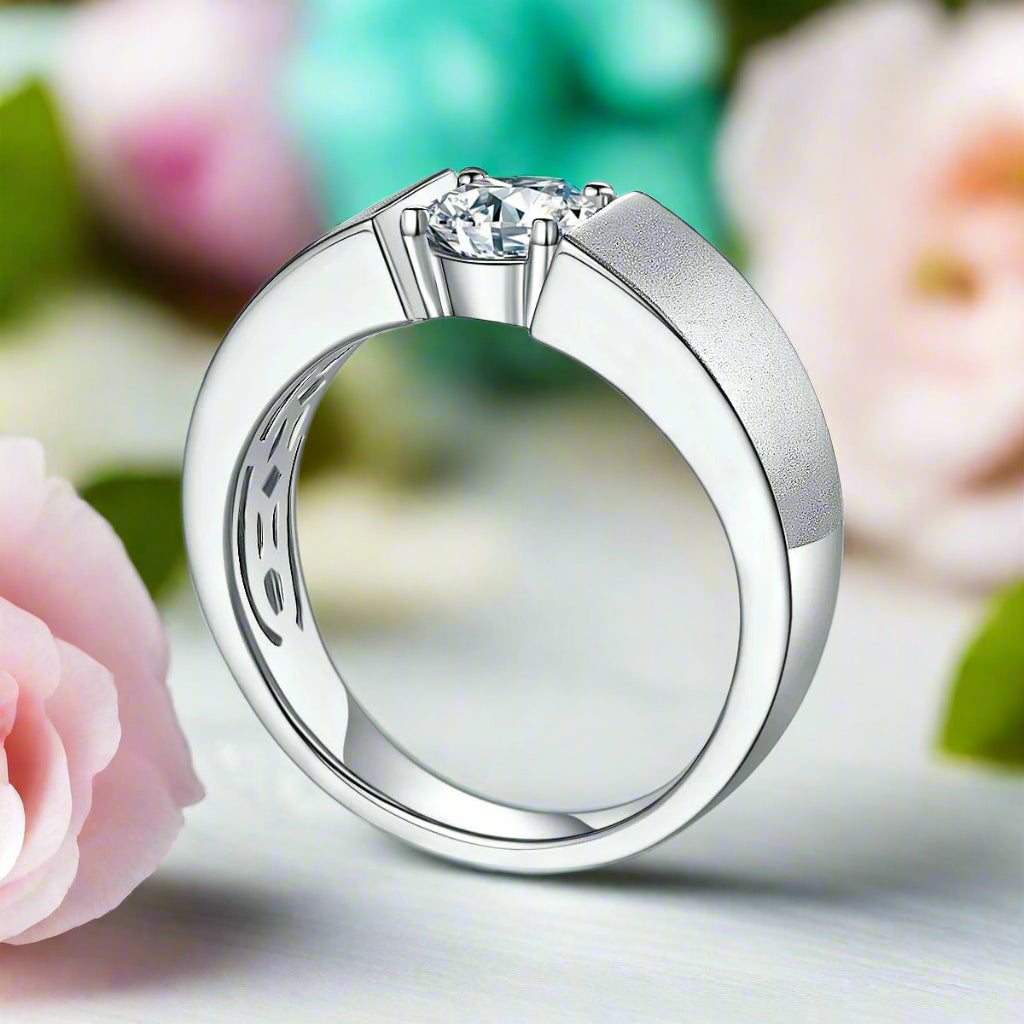 Experience the exquisite beauty of our 1.0 Ct Round Cut Moissanite Men's Solitaire Wedding Ring by Evani Naomi Jewelry. This handcrafted piece features a radiant 1 carat round cut solitaire stone, made with high-quality silver and hypoallergenic metals dipped in 18k white gold. It's a symbol of your eternal love, ethically sourced and carefully crafted for luxurious elegance at an affordable price.