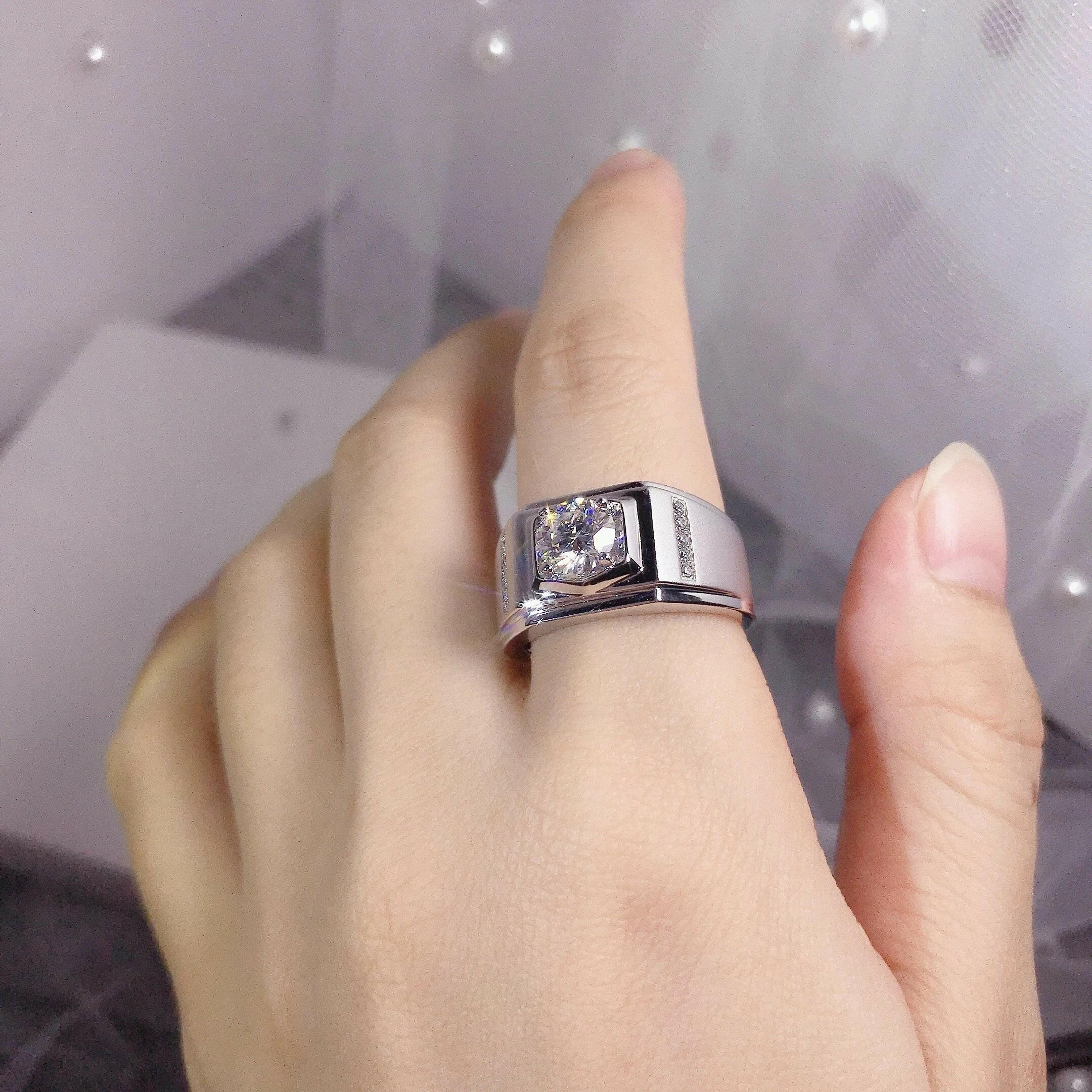 Our 1.0ct Solitaire Moissanite White Gold Men's Ring by Evani Naomi Jewelry is the perfect blend of high-quality craftsmanship and affordability. Made from 92.5% pure silver + 7.5% hypoallergenic metals, this ring is dipped 5x in 18k white gold for a radiance that will last a lifetime. The round cut diamond is flawless and looks identical to natural diamonds but costs much less. With its gorgeous, splendid, and captivating design, this ring is perfect for anyone who wants to add an elegant touch of class to their look at an affordable price.