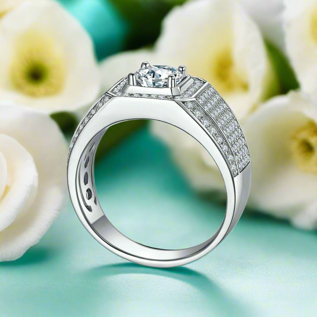 Get ready to make a bold style statement with the 3.0 Ct Moissanite Men's Ring in Pave Setting from Evani Naomi Jewelry. Exhibiting a gorgeous round cut moissanite stone, this ring is the epitome of sophistication and grandeur. What sets our pieces apart is their high-quality craftsmanship that's affordable as well. The stunning, sparkly stone looks identical to natural diamonds but costs much less, offering the same radiance at about 1% of the cost of a mined diamond. Created from 92.5% pure silver and 7.5% hypoallergenic metals, and then dipped five times in 18k white gold, this ring is ethically sourced, and finely handcrafted to last a lifetime - a true reflection of your enduring spirit.