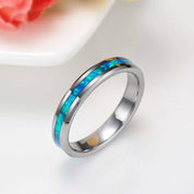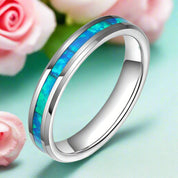 Experience the captivating charm of the Blue Opal Tungsten Men's Wedding Band from Evani Naomi Jewelry. Handcrafted with meticulous attention to detail, this 4mm ring features a stunning blue opal centerpiece, making it a true gem of both impeccable taste and ethical value.