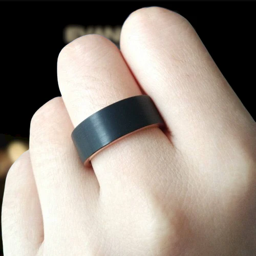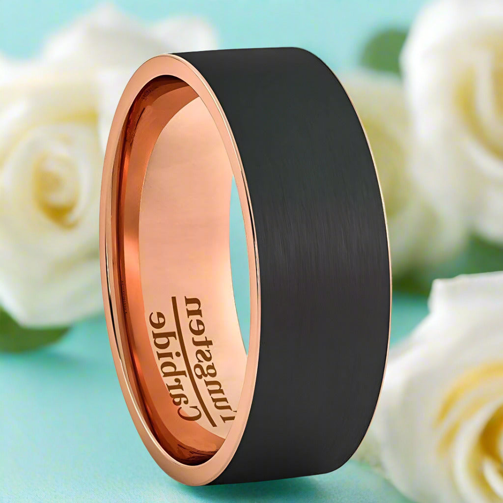 Enhance your special day with our Black & Rose Gold Tungsten Men's Wedding Band from Evani Naomi Jewelry. Expertly crafted and ethically sourced, it boasts a seamless blend of black and rose gold for a luxurious touch. Exuding elegance and durability, it's the perfect symbol of your eternal love.