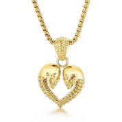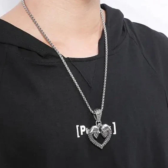 This stainless steel necklace features a unique heart-shaped pendant combining skull and skeleton motifs. Perfect for those who appreciate punk and goth styles, it offers a striking blend of vintage and modern design.