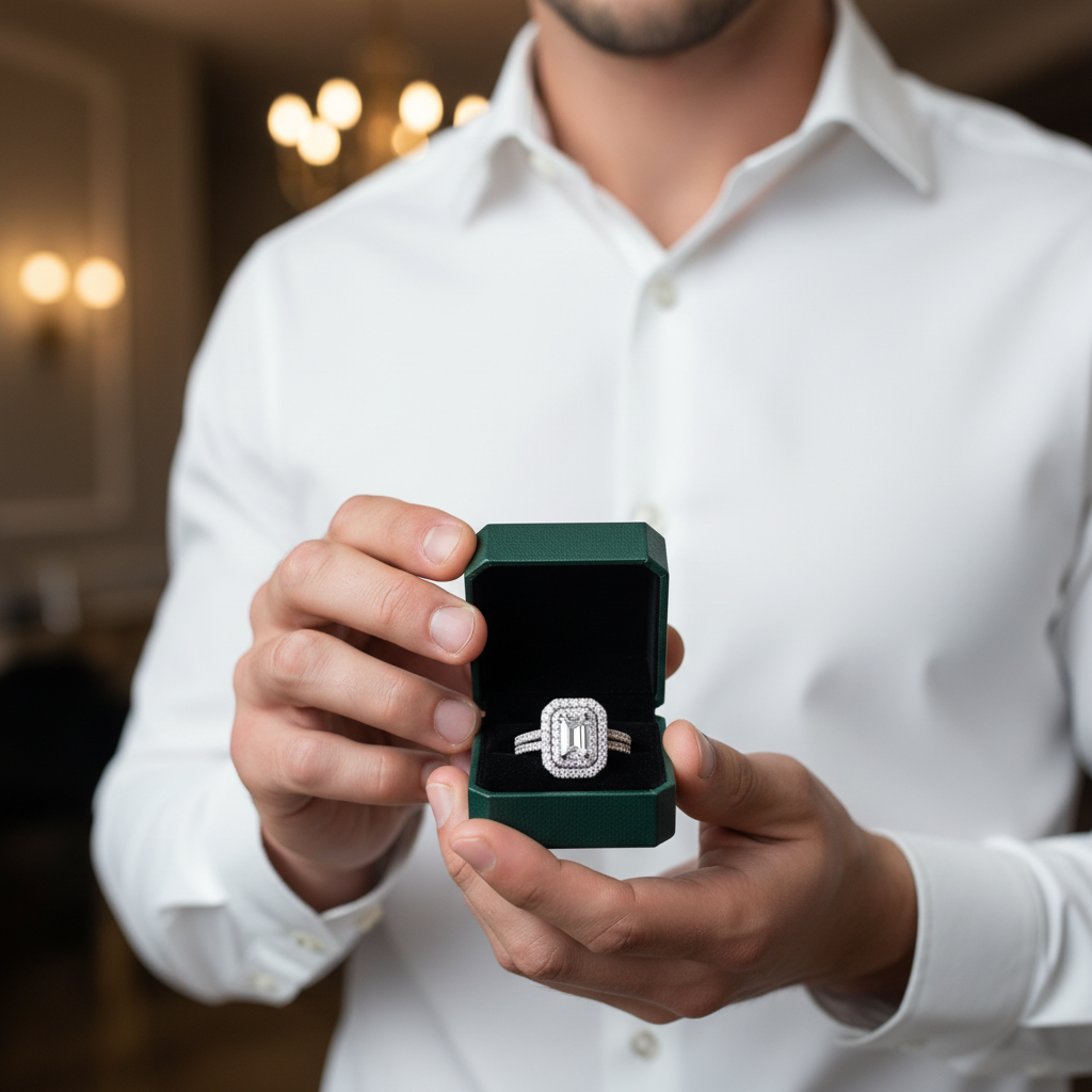 Refined 14K white gold engagement ring featuring an emerald cut moissanite centerpiece surrounded by a double halo design. Handcrafted for exceptional brilliance and longevity, offering sophisticated luxury at an attainable price.