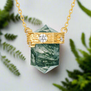 In a magical forest, a spirit gave his love a moss agate necklace, a tiny world of green for her to wear. Its gold finish chain shone with the same warmth as his promise of a love as pure and timeless as the forest itself.