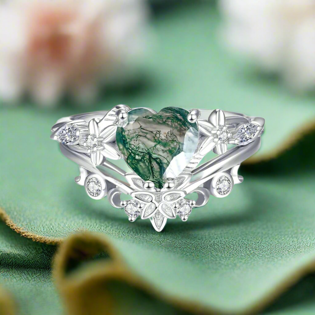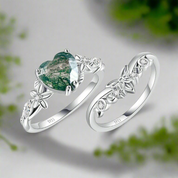 Important Note: Our moss agate ring is a poetic celebration of nature's endless beauty. Each piece is unique, with its ethereal green inclusions, like a miniature garden, gracefully entwined with delicate vines and leaves. The design whispers a story of love and new beginnings, symbolizing a bride blooming with her own distinct beauty, surrounded by the tender blessings of a verdant forest. It’s a truly romantic piece, as unique and captivating as the love it represents.