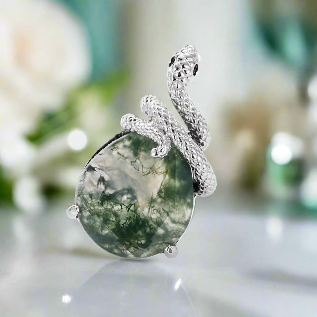 In a hidden glade where sunlight danced through emerald leaves, two lovers met beneath the whispering trees. He gifted her these moss agate earrings, their serpent embrace a symbol of eternal protection and devotion. Just as the moss agate holds the beauty of an enchanted forest within its depths, their love was timeless—rooted deep, unshaken, and forever intertwined.