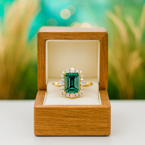 Halo Emerald Cut Yellow Gold Diamond Engagement Ring