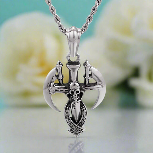 Make a statement with the Punk Skull and Sickle Revenge Necklace by Evani Naomi Jewelry . This rebellious piece is made from durable stainless steel, ensuring it will withstand whatever adventures come your way. The striking skull and sickle design adds a touch of gothic charm to any outfit, making it a must-have for those who like to stand out from the crowd. Affordable and high-quality, this necklace is the perfect accessory for the fearless and bold.