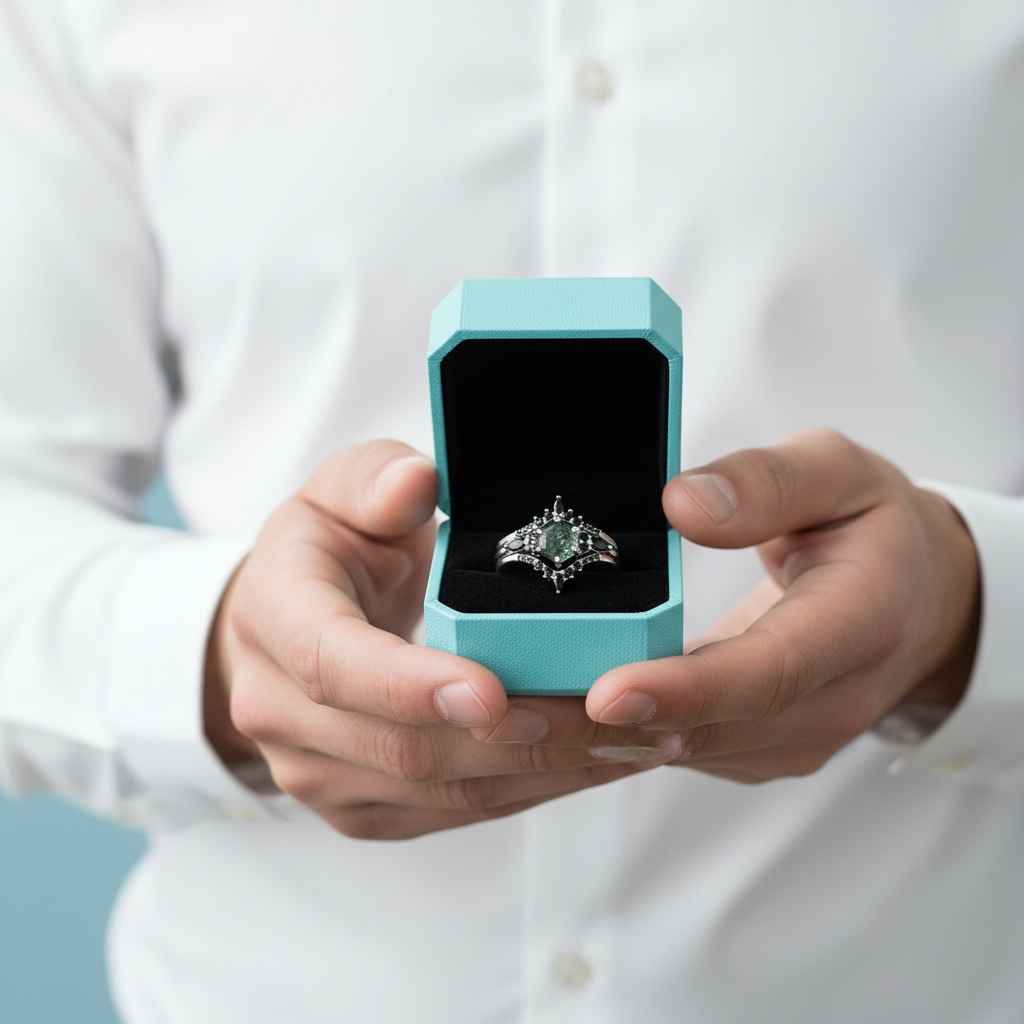 Under the silver glow of a moonlit forest, two souls met where fireflies danced like stars fallen to earth. He picked a ring kissed by nature itself — a moss agate stone, its green veins like tiny enchanted forests, framed by midnight gems as dark as the night sky.