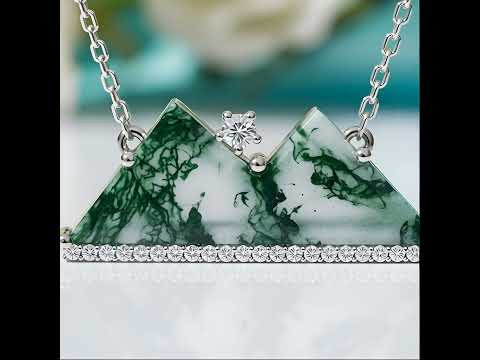 In a mystical land, a valiant mountain prince fell in love with a gentle spirit of the forest. He was as unyielding as the peaks, and she as nurturing as the moss. To capture their bond, a sorceress crafted a necklace from triangular moss agate stones, symbolizing their majestic love. The "mountains" were set in gleaming sterling silver and adorned with sparkling gems, representing a love as grand and eternal as the mountains themselves.