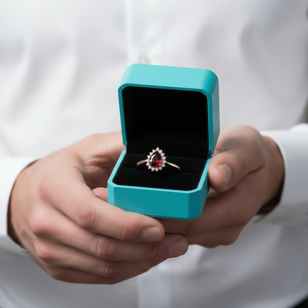 Ignite your passion with our stunning Pear Cut Ruby Birthstone Moissanite 14K Rose Gold Halo Engagement Ring. The Ruby is the highly coveted, fiery red variety of the mineral corundum, known as the "King of Gems." Its intense color, caused by chromium, is traditionally believed to bring good fortune, inspire confidence, and protect its wearer.