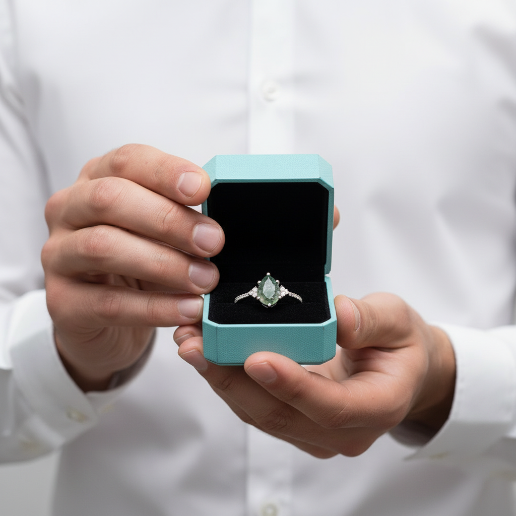 In a realm where emerald whispers danced on sun-kissed meadows, a ring of golden warmth, polished to a silken gleam, held the heart of an enchanted forest. Nestled within its embrace was a stone of dreams – a moss agate, where tiny landscapes of verdant green and misty white swirled like secrets shared between lovers under a twilight sky. It was a gift from one soul deeply connected to the wild magic to their beloved, a steadfast heart from another world. Their love story, much like the intricate patterns within the agate, was a tale of two worlds intertwining, of enduring devotion that bloomed as softly and surely as the moss on ancient trees. Each glance at the ring was a reminder of their whispered promises by moonlit streams, a tangible echo of a love as timeless and beautiful as the heart of the forest itself.