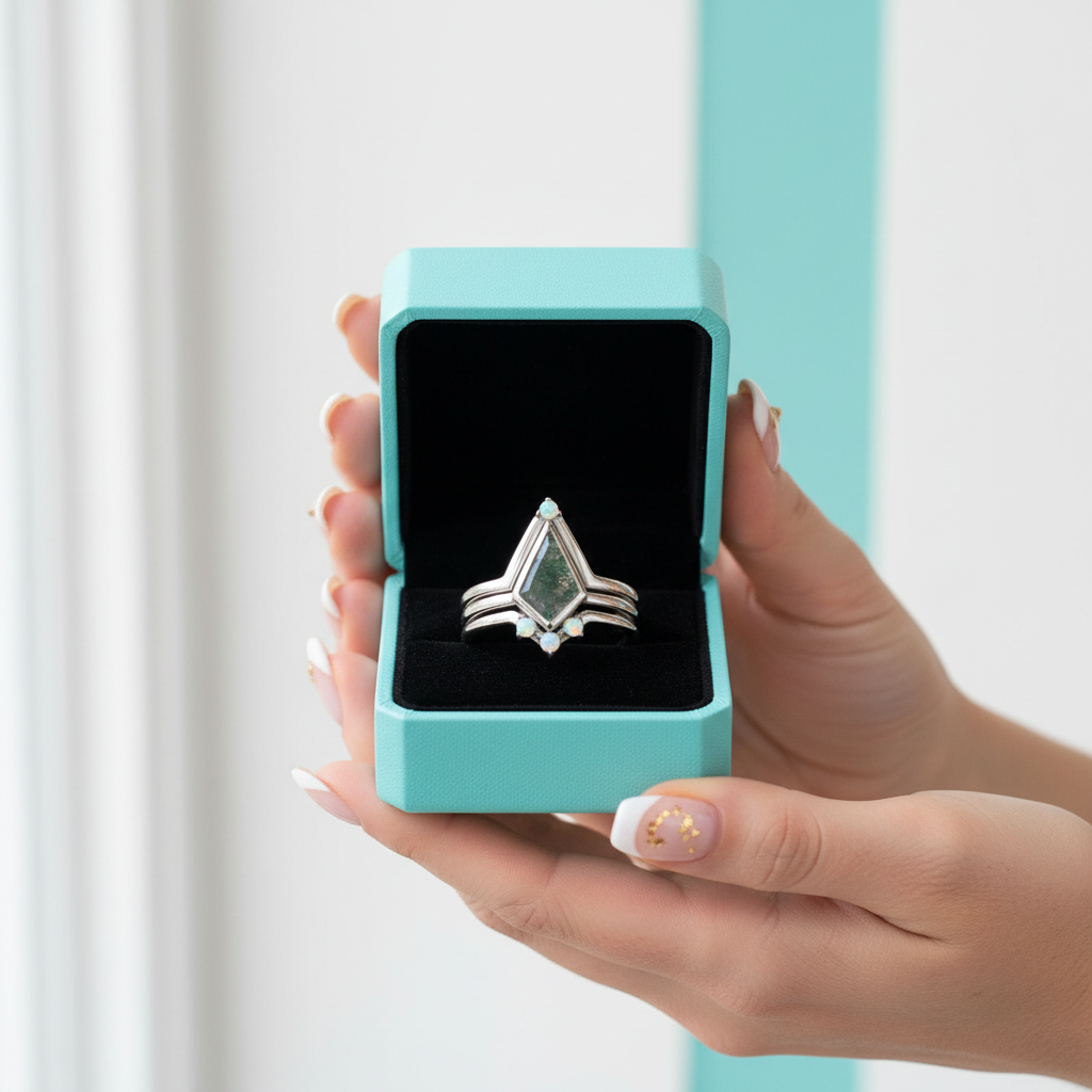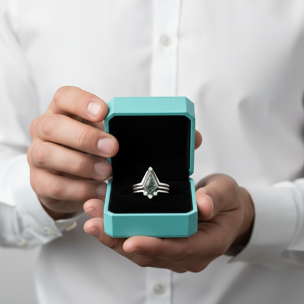 Beneath a canopy of whispering leaves, he knelt with a ring that mirrored the world they loved—moss agate for the forests they wandered, opals for the stars they dreamed under, and gold for the warmth that bound their hearts. She saw their story in its stones and said “yes,” knowing it was not just a ring, but a promise to grow together, rooted in love and lit with magic.