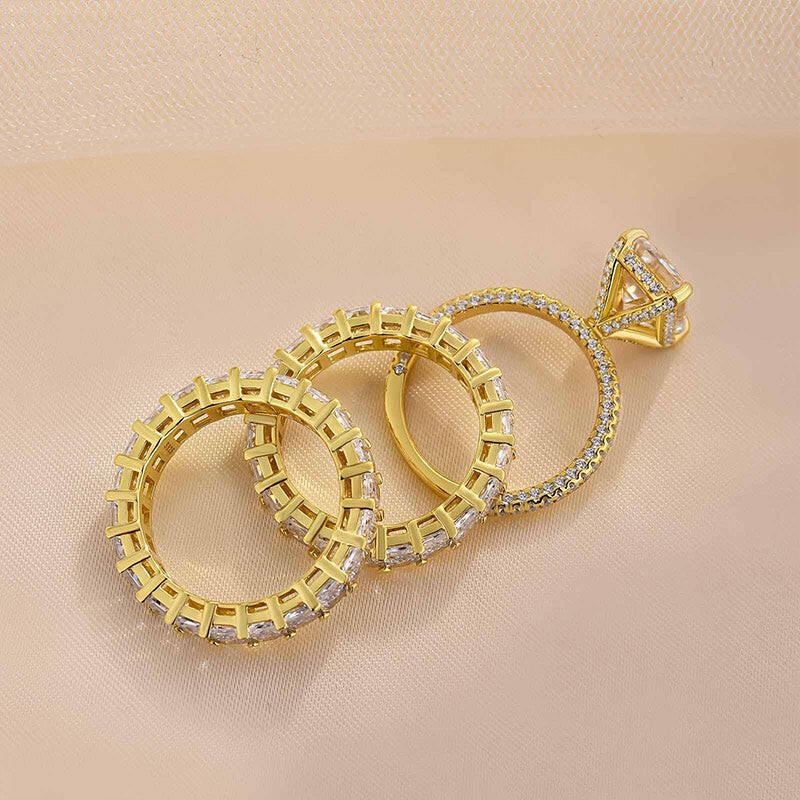 Wow your significant other with this stunning 4.0 Ct emerald cut 3PC wedding set. Made of exquisite 14k yellow gold, this gorgeous set features a radiant cut band stone that is sure to sparkle and shine, even in the dimmest of lights. Show your love and commitment in style with this breathtaking set.